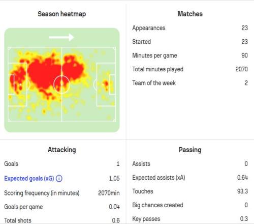 他的传球数量和精准度依然彰显着“掌控者”的风范,而这正是斯洛特体系下我们构建进攻的核心。