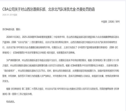 最后CBA反而处罚了杰曼:10号球员尤金·杰曼随后做出侮辱性手势,处以罚款人民币3万元的处罚。在队友被欺负的情况下,杰曼只是做出了手势,这就被罚款了?这不是在比赛中,已经处于赛后了,这样的处罚也很莫名其妙。