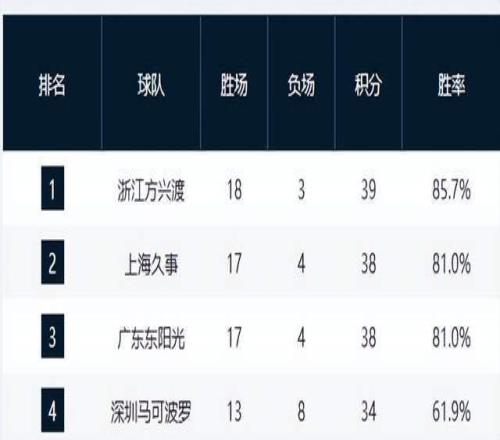 第4至第8名竞争异常胶着:青岛队浙江队同为12胜9负,分列第七、第八;青岛队遭遇五连败,状态低迷,而浙江队则保持稳定。此五队之间仅差1至2个胜场,任何一场胜负都可能引发排名洗牌。