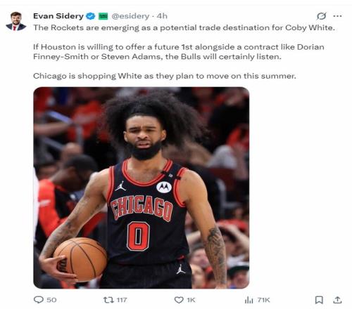 随后《福布斯体育》记者埃文-斯迪瑞报道,火箭已经成为科比-怀特的潜在交易下家,如果火箭队愿意提供一个首轮签,再加上芬尼-史密斯或者史蒂文-亚当斯这样的球员合同,那么公牛会考虑达成交易。