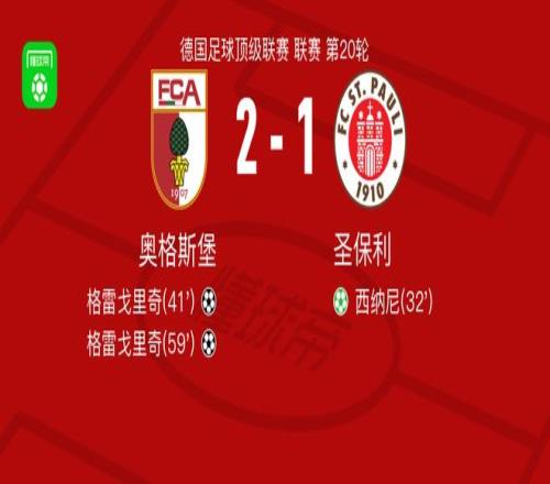 北京时间1月31日德国足球顶级联赛 联赛 第20轮,奥格斯堡主场对阵圣保利。奥格斯堡格雷戈里奇梅开二度。圣保利西纳尼破门。最终比分奥格斯堡 2-1 圣保利。